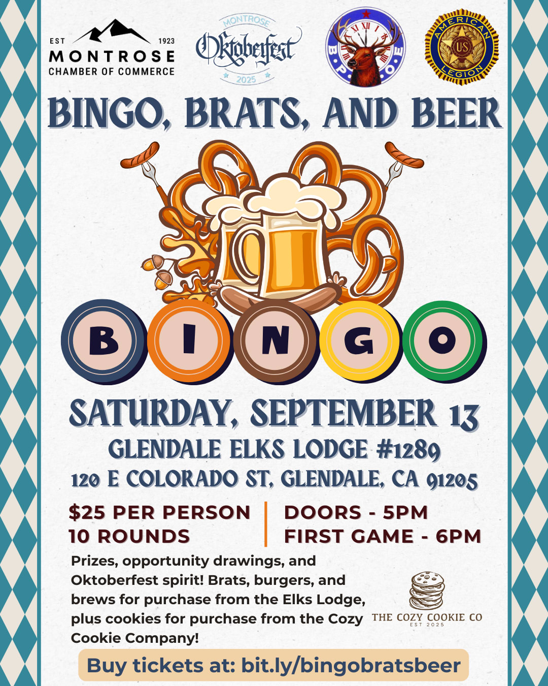 We’ll play 10 rounds of Bingo with great prizes and opportunity drawings throughout the night. The Elks Lodge will be serving up* brats, burgers, and brews all night long, available for purchase to keep your stein and stomach full! Plus, you can satisfy your sweet tooth with cookies available to purchase from the Cozy Cookie Company!