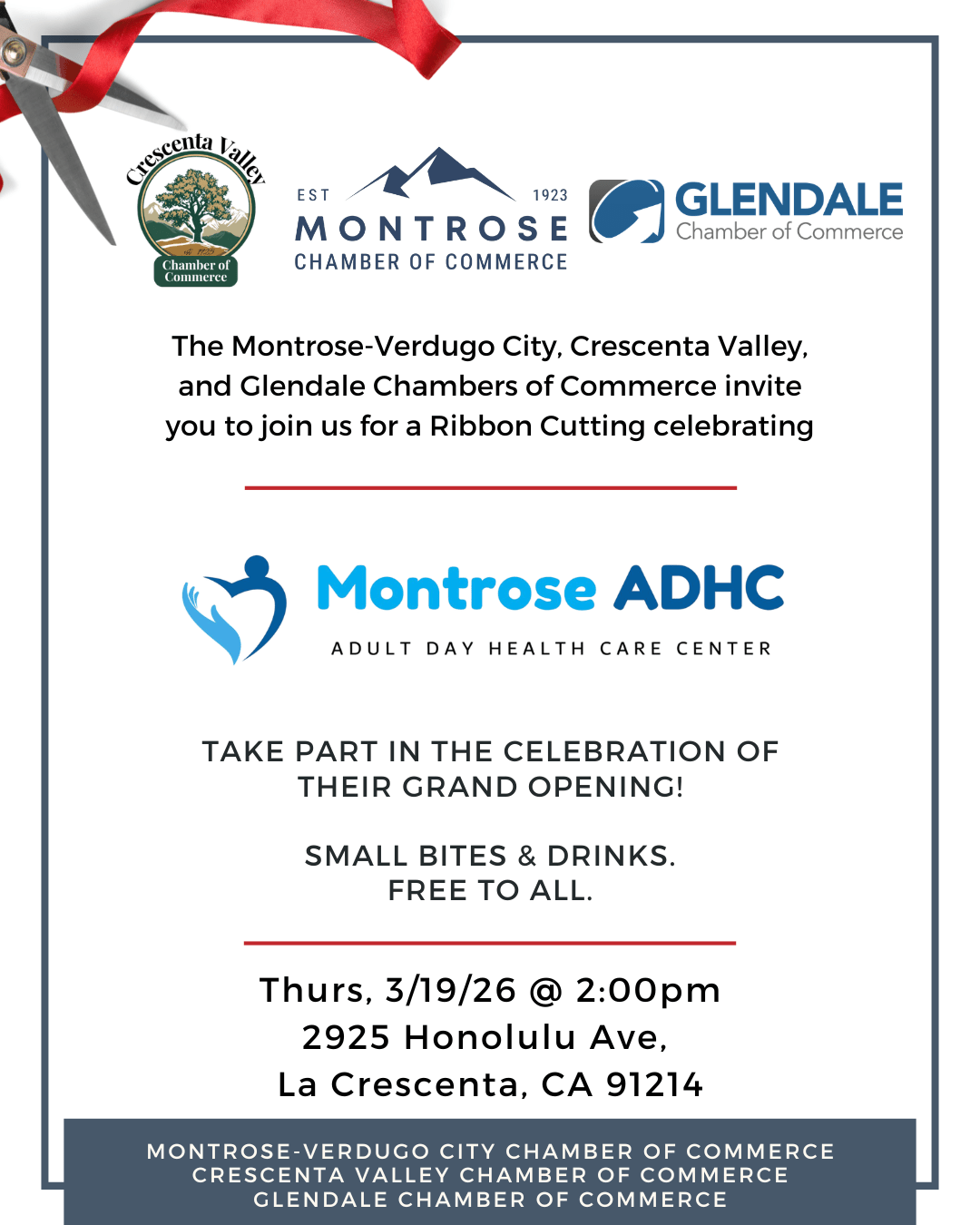 The Montrose-Verdugo City, Crescenta Valley, and Glendale Chambers of Commerce invite you to join us for a Ribbon Cutting celebrating the grand opening of Montrose ADHC at 2pm!
